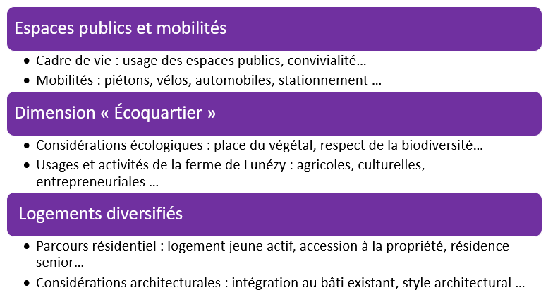 Votre implication est essentielle pour imaginer un quartier qui réponde aux besoins de toutes et tous et qui s’inscrive dans la durée.Vos avis et propositions nourriront directement le projet et permettront d’enrichir les décisions prises, afin de bâtir un cadre de vie à l’image des habitants de Nozay.